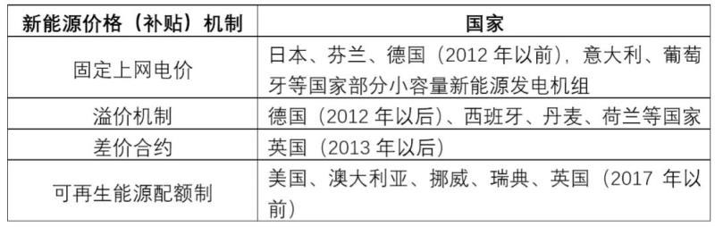 國外新能源價格機制主要包括固定上網電價、溢價機制、差價合約(Contract for difference)、可再生能源配額制等。