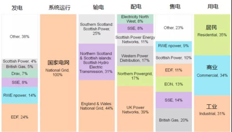 發(fā)電環(huán)節(jié):按照發(fā)電量,法國電力集團(tuán)(EDF)占比24%,萊茵集團(tuán)(RWE npower)占比14%,蘇格蘭南部電力(Scottish Southern Energy,SSE)占比8%,德拉克斯公司(Drax)占比7%,英國天然氣公司(British Gas)占比5%,蘇格蘭電力(Scottish Power)占比4%,其他發(fā)電公司占比38%。