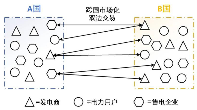 二是由兩國發(fā)電企業(yè)、電力用戶、售電公司等市場主體進(jìn)行直接對接協(xié)商,開展電力交易。協(xié)議達(dá)成后,市場主體應(yīng)將協(xié)議在規(guī)定的時(shí)間內(nèi)提交至所在國家或地區(qū)的電力調(diào)度、交易機(jī)構(gòu)。市場化雙邊交易示意如圖2所示。