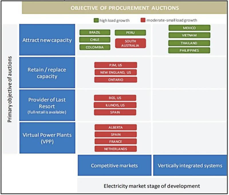 電力行業(yè)也廣泛地應(yīng)用各種各樣的拍賣方式作為交易方式,例如許多發(fā)展中國家就針對電廠和輸電資產(chǎn)的特許經(jīng)營權(quán)運(yùn)用了第一價(jià)格暗標(biāo)拍賣,而電力市場集中競價(jià)交易中常談到的統(tǒng)一出清以及按報(bào)價(jià)支付(Pay as Bid)實(shí)質(zhì)也是兩種拍賣方式,美國、西班牙、哥倫比亞等國則在容量市場采用“荷式時(shí)鐘拍賣”。