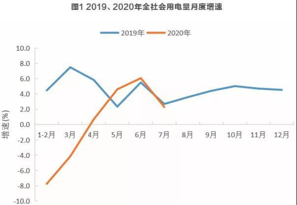 全社會用電量增速總體呈顯著回升態(tài)勢。2020年1-7月,全國全社會用電量40381億千瓦時,同比下降0.7%,增速同比降低5.3個百分點。分月看,全社會用電量增速自3月份起逐月回升,4月份由負轉(zhuǎn)正,5月份首超上年同期水平,6月份達到6.1%,7月份受長江中下游降水異常偏多、華北華東華中氣溫明顯偏低等因素影響,增速為2.3%,同比、環(huán)比分別下降0.4、3.8個百分點。