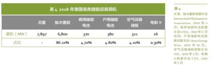 德國儲能設(shè)施主要包括抽水蓄能、電池儲能、壓縮空氣儲能(CAES)以及電制 X (PtX)。截至 2018 年,德國儲能裝機容量已達(dá)到近 790 萬千瓦,主要為電力系統(tǒng)提供快速和短期的靈活性服務(wù),其中抽水蓄能仍然是德國目前裝機容量最大、經(jīng)濟(jì)性最好的儲能設(shè)施;隨著技術(shù)的發(fā)展和成本降低,電池儲能也開始進(jìn)入到大型商業(yè)化應(yīng)用階段,技術(shù)類型和商業(yè)模式逐漸多樣化;壓縮空氣儲能具有靈活性高且運行穩(wěn)定的優(yōu)勢,但由于建設(shè)條件較為苛刻,目前德國僅有一個商業(yè)化運行項目;當(dāng)前電制 X 在德國還處在小規(guī)模試驗階段,預(yù)計 2020 年后才會陸續(xù)實現(xiàn)大規(guī)模商業(yè)化運行。
