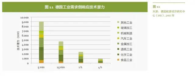 工業(yè)用戶主要通過短暫加快或放緩生產(chǎn)活動,或者改變生產(chǎn)時間來提供需求響應(yīng)。德國能源署(dena)研究表明,德國幾乎所有的工業(yè)部門如冶金業(yè)、化工、橡膠和塑料工業(yè)都能提供不同程度的需求側(cè)靈活性服務(wù),其中大型高耗能企業(yè)可以獨立參與靈活性服務(wù),而小型用能企業(yè)則通過虛擬電廠(VPP)模式集中參與。據(jù)德國能源經(jīng)濟(jì)研究中心(FfE)評估,德國擁有 900 萬千瓦的工業(yè)負(fù)荷可以通過中斷的方式提供 5 分鐘以內(nèi)的需求側(cè)響應(yīng),擁有 250 萬千瓦的負(fù)荷可以連續(xù)提供 1 小時以上的靈活性服務(wù)。其中化工、冶金企業(yè)相較于其他部門擁有更大的需求響應(yīng)潛力,例如 Trimet 公司是德國最大的鋁生產(chǎn)和冶煉企業(yè),也是德國最先進(jìn)的工業(yè)用戶靈活性供應(yīng)商,一秒鐘能夠調(diào)節(jié)負(fù)荷8~60 萬千瓦,可以為電力系統(tǒng)提供一級備用、二級備用以及可中斷負(fù)荷服務(wù)。
