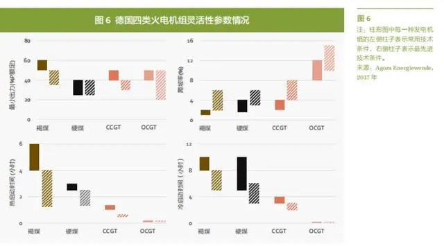隨著大量風(fēng)光可再生能源發(fā)電并網(wǎng),德國很多火電廠由于發(fā)電利用小時數(shù)偏低而面臨倒閉的風(fēng)險,為此提供電力系統(tǒng)靈活性服務(wù)成為火電企業(yè)新的盈利點。德國火電企業(yè)主要通過降低最小出力、提高爬坡速率、縮短啟動時間以及為 CHP 機組增加儲熱裝置等措施來提升機組的靈活性。四種火電機組中,總體來看 OCGT 靈活性最強,褐煤機組靈活性最差;常規(guī) OCGT 單循環(huán)燃?xì)廨啓C的平均爬坡率可以達(dá)到 8%~12%/ 分鐘,是其他機組的 4~6 倍,而熱啟動和冷啟動時間相比 CCGT 的 3~4 小時和煤電機組的 1~10 小時,OCGT 只需要 5~11 分鐘;硬煤機組最小穩(wěn)定出力優(yōu)勢明顯,可以壓至額定容量的