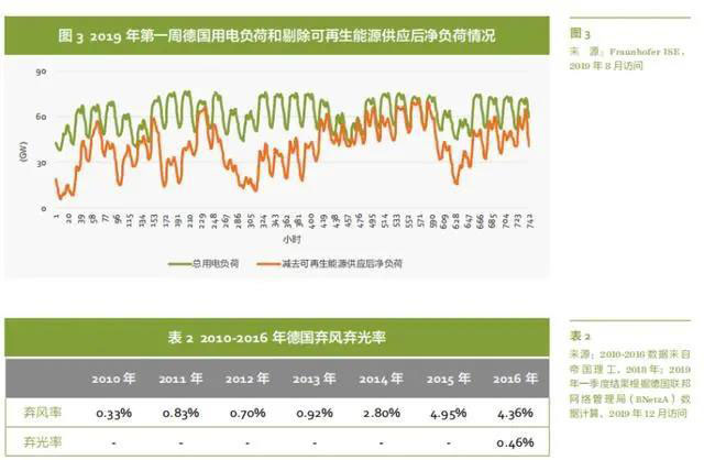 受生物質(zhì)發(fā)電成本和資源制約,風(fēng)電和光伏發(fā)電是德國可再生能源比重提升的主要依靠力量。但同時,風(fēng)電和光伏發(fā)電比重的大幅提高對于德國電力系統(tǒng)靈活運行也提出了更高要求。以 2019 年 1 月冬季為例,除去可再生能源供給后德國凈負(fù)荷的波動性大幅增加。當(dāng)前德國通過充分挖掘火電機組、跨省區(qū)跨境輸電、需求側(cè)響應(yīng)以及儲能等不同途徑的靈活性潛力,利用多級市場,保障了其電力系統(tǒng)安全、可靠運行,控制可再生能源棄電率處于 2~4% 的合理范圍之內(nèi)。但隨著可再生能源發(fā)電量占比突破 30%,德國的棄風(fēng)率開始呈上升趨勢。