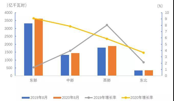 8月份,東、中、西部和東北地區(qū)全社會用電量增速分別為9.1%、7.8%、5.9%和3.7%,其中,東、中部和東北地區(qū)全社會用電量增速比上月提高7.1、11.9和1.2個(gè)百分點(diǎn),西部地區(qū)全社會用電量增速比上月回落1.9個(gè)百分點(diǎn)。