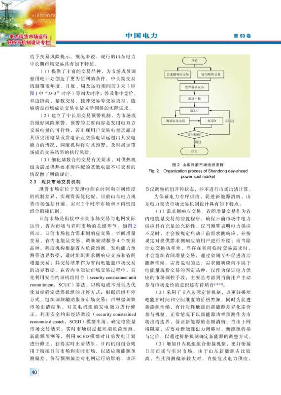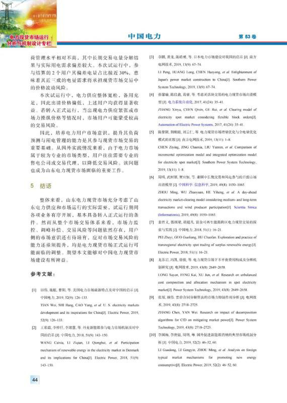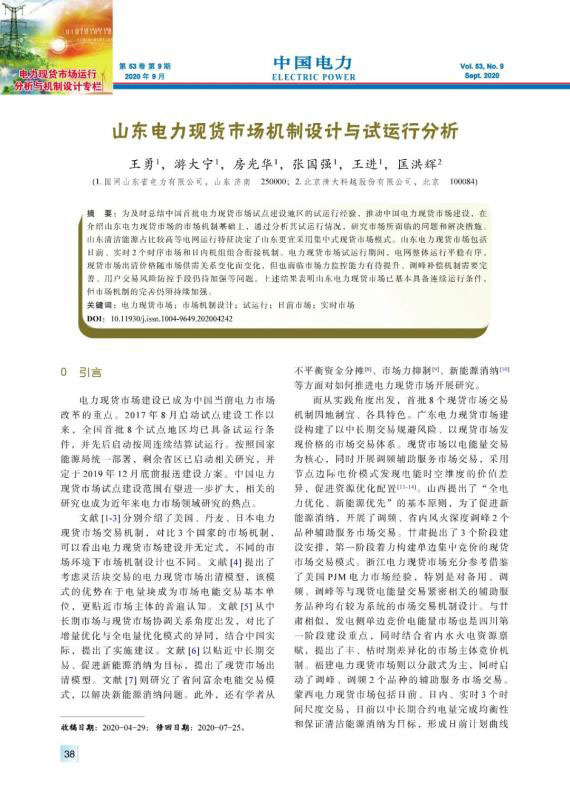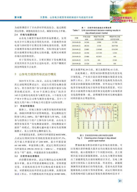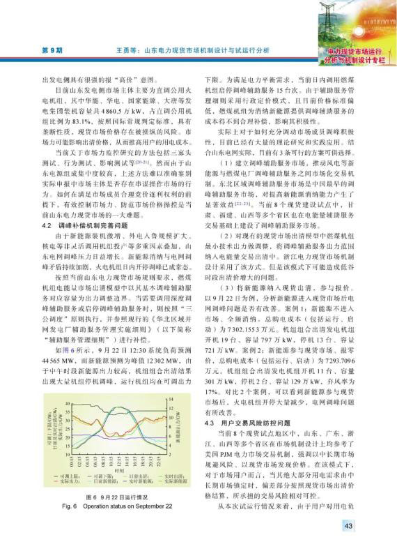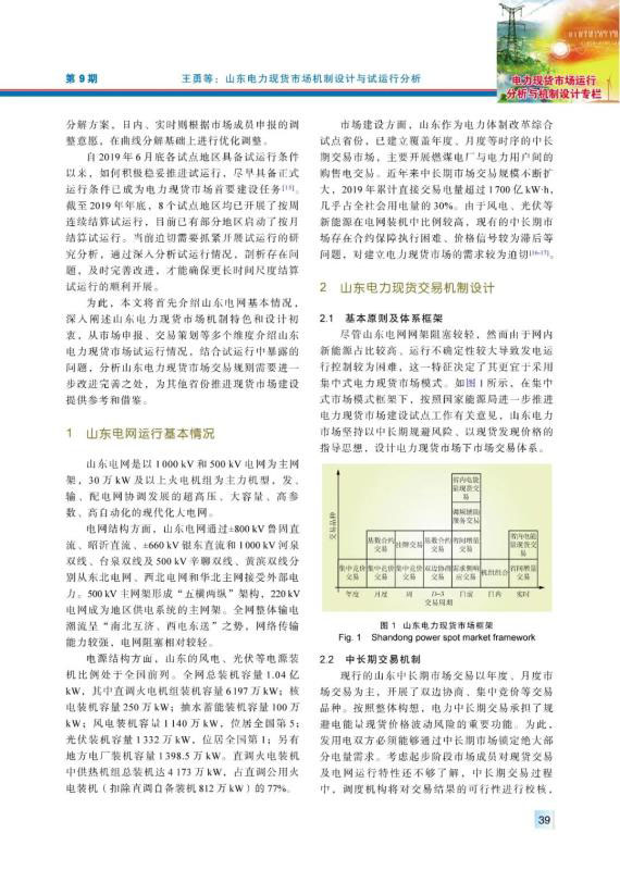 為及時總結(jié)中國首批電力現(xiàn)貨市場試點建設(shè)地區(qū)的試運(yùn)行經(jīng)驗,推動中國電力現(xiàn)貨市場建設(shè),在介紹山東電力現(xiàn)貨市場的市場機(jī)制基礎(chǔ)上,通過分析其試運(yùn)行情況,研究市場所面臨的問題和解決措施。山東清潔能源占比較高等電網(wǎng)運(yùn)行特征決定了山東更宜采用集中式現(xiàn)貨市場模式。山東電力現(xiàn)貨市場包括日前、實時2個時序市場和日內(nèi)機(jī)組組合銜接機(jī)制。電力現(xiàn)貨市場試運(yùn)行期間,電網(wǎng)整體運(yùn)行平穩(wěn)有序,現(xiàn)貨市場出清價格隨市場供需關(guān)系變化而變化,但也面臨市場力監(jiān)控能力有待提升、調(diào)峰補(bǔ)償機(jī)制需要完善、用戶交易風(fēng)險防控手段仍待加強(qiáng)等問題。上述結(jié)果表明山東電力現(xiàn)貨市場已基本具備連續(xù)運(yùn)行條件,但市場機(jī)制的完善仍須持續(xù)加強(qiáng)。