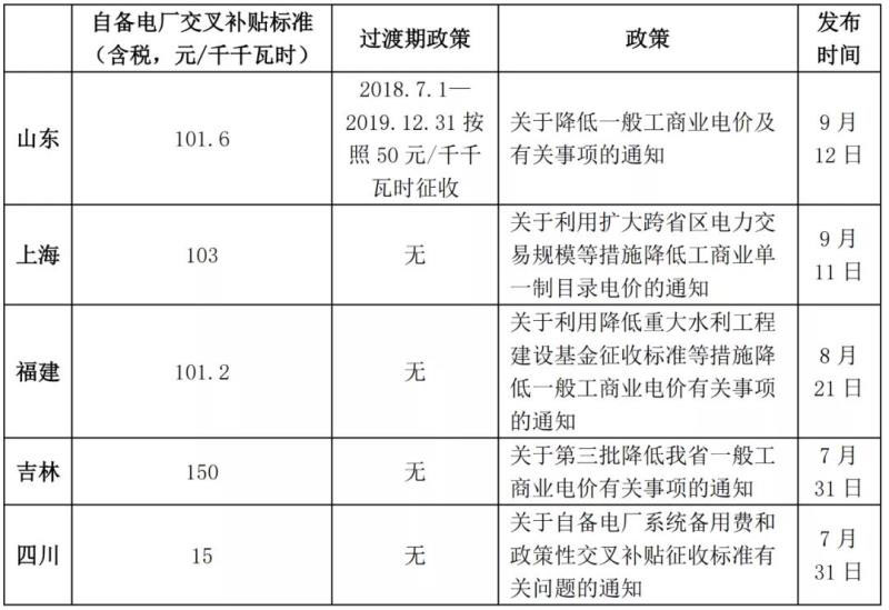 除此之外,山東、上海、福建、吉林和四川等五省市已分別出臺(tái)相關(guān)辦法,確定了自備電廠交叉補(bǔ)貼標(biāo)準(zhǔn)。
