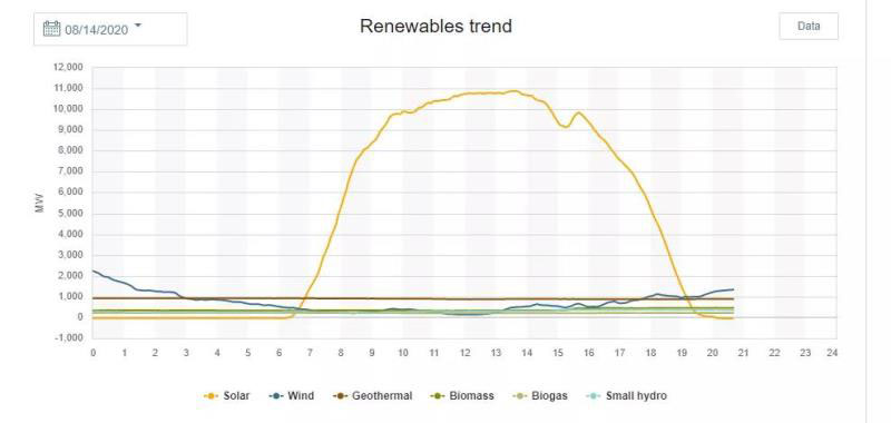 夜間電網(wǎng)的主力是天然氣發(fā)電。超過(guò)24000MW的出力占到了電網(wǎng)發(fā)電容量的一半以上。除此之外,CAISO還要進(jìn)口約8000MW,約占20%左右的電力。