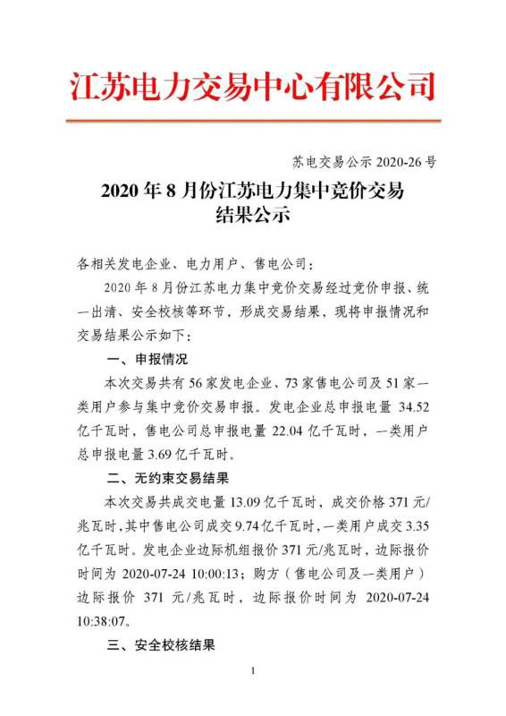 2020年8月份江蘇電力集中競價交易結(jié)果公示