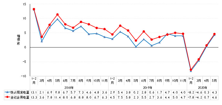 從月度數(shù)據(jù)看,統(tǒng)計(jì)局發(fā)電量與全社會(huì)用電量增速差異明顯,且通常前者低于后者。2018年以來,全國月度發(fā)、用電量增速最大差異為3.4個(gè)百分點(diǎn)、平均為1.4個(gè)百分點(diǎn)。2020年前5個(gè)月統(tǒng)計(jì)局發(fā)電量與全社會(huì)用電量增速趨同,平均差異降至0.4個(gè)百分點(diǎn),主要原因是新冠肺炎疫情導(dǎo)致分布式發(fā)電、小水電增長放緩。