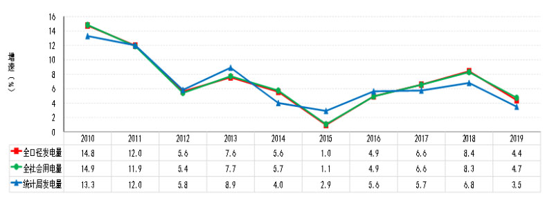 圖1 2010~2019年全國年度發(fā)、用電量增速對比
