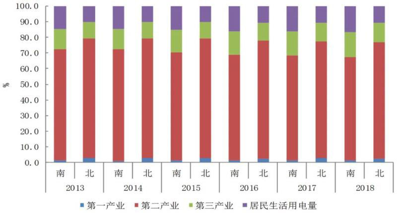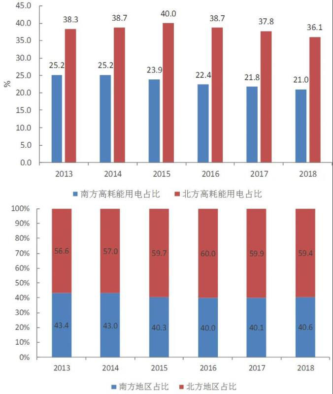 從用電比重看,南方地區(qū)傳統(tǒng)高耗能行業(yè)用電量占其全社會(huì)用電量的比重明顯低于北方地區(qū),且持續(xù)下降。2013-2018年,南方地區(qū)傳統(tǒng)高耗能行業(yè)用電占比從25.2%下降到21.0%,下降趨勢(shì)明顯;北方地區(qū)傳統(tǒng)高耗能行業(yè)用電占比從38.3%下降到36.1%,呈現(xiàn)緩慢下降態(tài)勢(shì),且高于南方地區(qū)15個(gè)百分點(diǎn)左右。