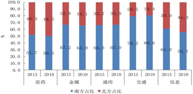 從細(xì)分行業(yè)地區(qū)布局看,通用及專用設(shè)備制造業(yè)、交通運(yùn)輸/電氣/電子設(shè)備制造業(yè)行業(yè)用電進(jìn)一步向南方地區(qū)集聚。2013-2018年,南方地區(qū)醫(yī)藥制造業(yè)、金屬制品業(yè)、通用及專用設(shè)備制造業(yè)、交通運(yùn)輸/電氣/電子設(shè)備制造業(yè)、信息傳輸/計(jì)算機(jī)服務(wù)和軟件業(yè)用電占其全國用電比重均高于北方地區(qū),其中通用及專用設(shè)備制造業(yè)、交通運(yùn)輸/電氣/電子設(shè)備制造業(yè)用電比重分別上升0.7、1.1個(gè)百分點(diǎn)。