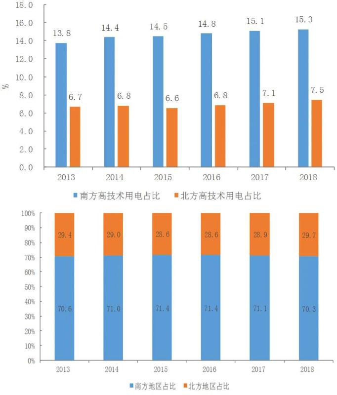 從用電比重看,南方地區(qū)高技術(shù)產(chǎn)業(yè)用電量占其全社會(huì)用電量的比重明顯高于北方地區(qū),呈現(xiàn)較快上升趨勢(shì)。2013-2018年,南方地區(qū)高技術(shù)產(chǎn)業(yè)用電量占其全社會(huì)用電量比重從13.8%調(diào)整為15.3%;北方地區(qū)高技術(shù)產(chǎn)業(yè)用電占比從6.7%調(diào)整為7.5%,上升趨勢(shì)不明顯。