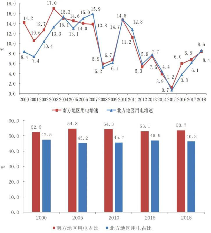 2015年以來,全國地區(qū)用電增速由“北快南慢”轉(zhuǎn)變?yōu)椤澳峡毂甭保?南方地區(qū)用電占全國比例低于其GDP占全國比例約7個(gè)百分點(diǎn)。