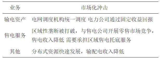 在電力市場化進(jìn)程中,傳統(tǒng)電力公司的業(yè)務(wù)模式、經(jīng)營模式等受到?jīng)_擊,如表1所示。輸電網(wǎng)資產(chǎn)則由調(diào)度機(jī)構(gòu)統(tǒng)一調(diào)度,電力公司獲得固定投資回報收益;電力公司的供電服務(wù)則需要參與零售電力市場的競爭,但同時還需要承擔(dān)社會公益的托底服務(wù)。售電市場的開放使得電網(wǎng)公司的售電業(yè)務(wù)受到侵蝕,售電收入降低是不可避免的趨勢。并且,電力公司作為售電服務(wù)托底機(jī)構(gòu),需要承擔(dān)保證電力服務(wù)的社會義務(wù),無法選擇用戶,而非電網(wǎng)售電公司可以選擇可以帶來高收益的用戶,顯然對于電力公司是不公平的。還有,由于負(fù)荷側(cè)分布式電源技術(shù)的發(fā)展和需求響應(yīng)資源參與市場,改變了負(fù)荷發(fā)展的趨勢和降低了對輸配電網(wǎng)絡(luò)的利用,輸配電收入也隨著減少,電力公司過去對于輸配電的投資無法按照原計劃回收,對電力公司的正常運(yùn)營帶來巨大挑戰(zhàn)。