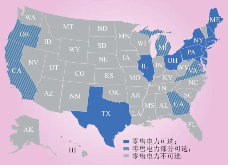 在零售側(cè),美國電力市場改革的重點(diǎn)是允許具有競爭性的電力服務(wù)公司參與電力供給,同時賦予電力用戶在不同電力服務(wù)公司之間自由選擇的權(quán)利,以消除傳統(tǒng)電力公司在銷售端的壟斷。美國零售市場的監(jiān)管是在州層面進(jìn)行的,各州根據(jù)自身情況制定電力零售市場的政策法規(guī),因此,并大部分州尚未開放零售競爭。有的州開放了電力零售市場的競爭,即允許電力用戶在競爭性零售供應(yīng)商之間進(jìn)行選擇,零售電價會隨著電力供需關(guān)系變化和不同的服務(wù)計劃而不同;有的州仍然是傳統(tǒng)的壟斷電力供應(yīng),即消費(fèi)者不能選擇供電公司,只能從所在地區(qū)的電力公司購買電力,但零售價格受到政府監(jiān)管;還有的州部分開放零售電力選擇。截至2017年,美國零售市場壟斷和競爭模式的分布如圖2所示。