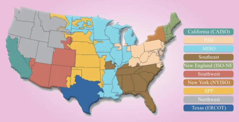 圖1 美國部分批發(fā)電力市場格局(2017年)