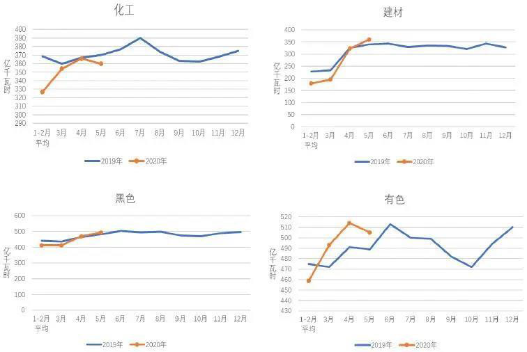 圖4 2019、2020年重點(diǎn)行業(yè)分月用電量情況