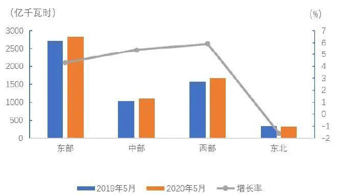 5月份,東、中、西部和東北地區(qū)全社會(huì)用電量增速分別為4.3%、5.4%、5.9%和-1.6%,增速分別比上月回升6.1、3.5、1.7和下降1.7個(gè)百分點(diǎn)。