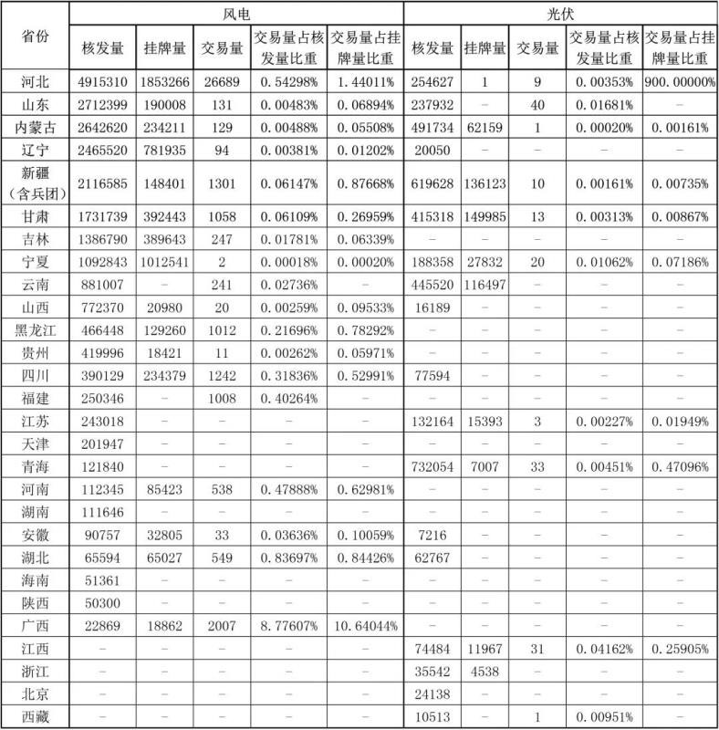 中國綠色電力證書認(rèn)購交易平臺(tái)顯示,自實(shí)行綠證核發(fā)及交易以來,全國共核發(fā)風(fēng)電綠證23315779張(約23.32億千瓦時(shí))、光伏綠證3845828張(約3.85億千瓦時(shí)),風(fēng)電綠證掛牌量為5607605張、光伏綠證掛牌量為531502張,風(fēng)電綠證成交量為36312張、光伏綠證成交量為161張。其中風(fēng)電交易量占核發(fā)量的0.156%、交易量占掛牌量的0.648%,光伏交易量占核發(fā)量的0.0042%、交易量占掛牌量的0.03%。全國各省份綠證核發(fā)及交易情況詳見圖1~6、表1。
