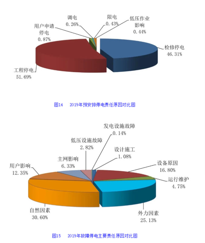 2019年,“計(jì)劃停電”仍是造成我國中壓用戶停電的主要原因,占用戶總停電時(shí)間的59.84%,影響用戶平均停電時(shí)間為8.21小時(shí)/戶。其中,工程與檢修停電分別占預(yù)安排總停電時(shí)間的51.69%、46.31%;“故障停電”占總停電的40.16%,影響用戶平均停電時(shí)間為5.51小時(shí)/戶。