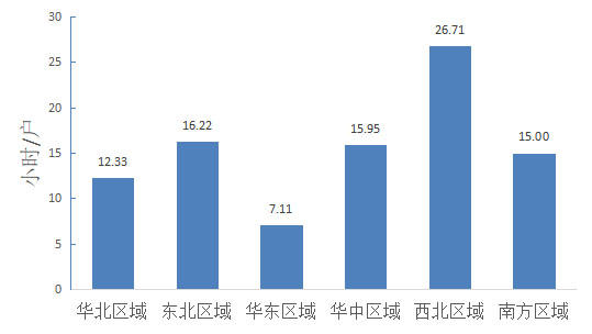 2019年華北、東北、華東、華中、西北、南方六大區(qū)域中,華東區(qū)域用戶的平均供電可靠率最高,平均停電時(shí)間為7.11小時(shí)/戶。西北區(qū)域用戶的平均供電可靠率最低,平均停電時(shí)間為26.71小時(shí)/戶。