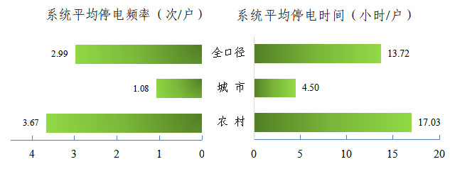2019年全國用戶平均停電時(shí)間13.72小時(shí)/戶,同比減少2.03小時(shí)/戶,其中,城市地區(qū)4.50小時(shí)/戶,農(nóng)村地區(qū)17.03小時(shí)/戶。城市和農(nóng)村相差12.53小時(shí)/戶。全國用戶平均停電頻率2.99次/戶,同比減少0.29次/戶,其中,城市地區(qū)1.08次/戶,農(nóng)村地區(qū)3.67次/戶,城市和農(nóng)村相差2.59次/戶。