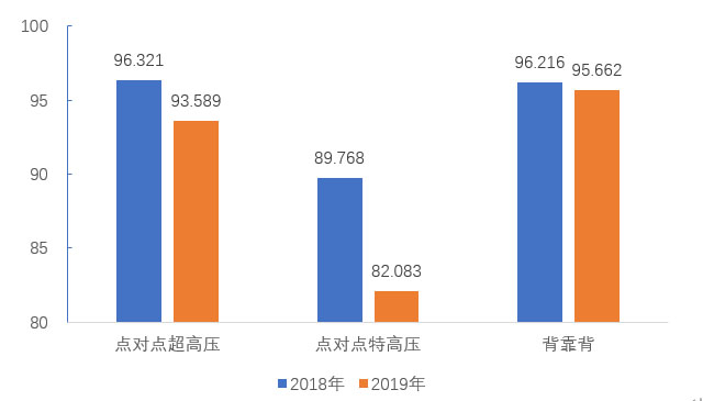 2019年,納入可靠性統(tǒng)計(jì)的點(diǎn)對(duì)點(diǎn)超高壓直流輸電系統(tǒng)能量可用率為93.589%,同比下降2.732百分點(diǎn);點(diǎn)對(duì)點(diǎn)特高壓直流輸電系統(tǒng)能量可用率為82.0.83%,同比下降7.685個(gè)百分點(diǎn);背靠背直流輸電系統(tǒng)能量可用率為95.662%,同比下降0.554個(gè)百分點(diǎn)。