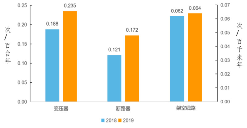 2019年,架空線路、變壓器、斷路器三類主要設(shè)施的強(qiáng)迫停運(yùn)率分別為0.064次/百千米年、0.235次/百臺(tái)年、0.172次/百臺(tái)年,同比分別增加0.002次/百千米年、0.047次/百臺(tái)年、0.051次/百臺(tái)年。