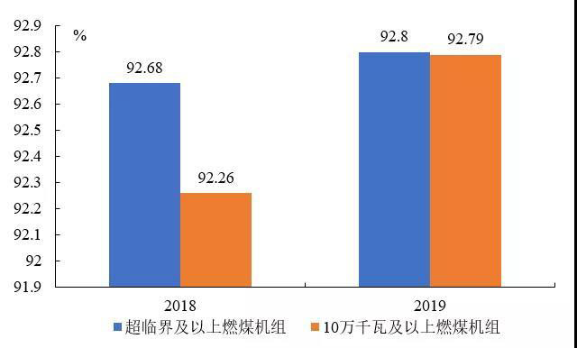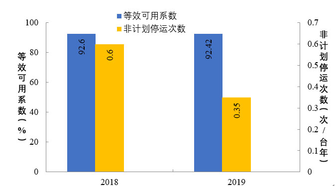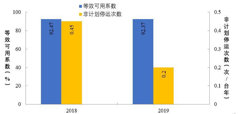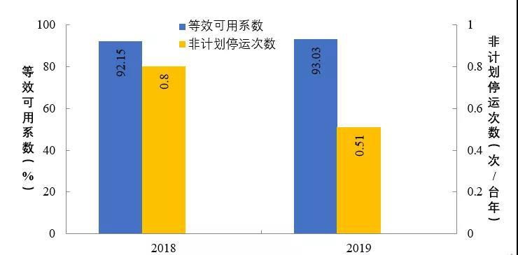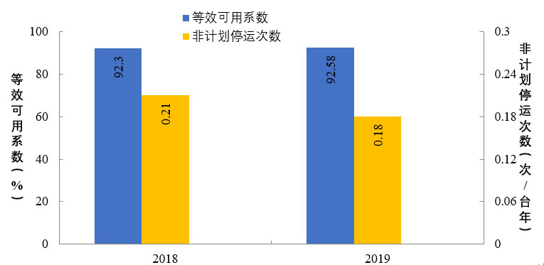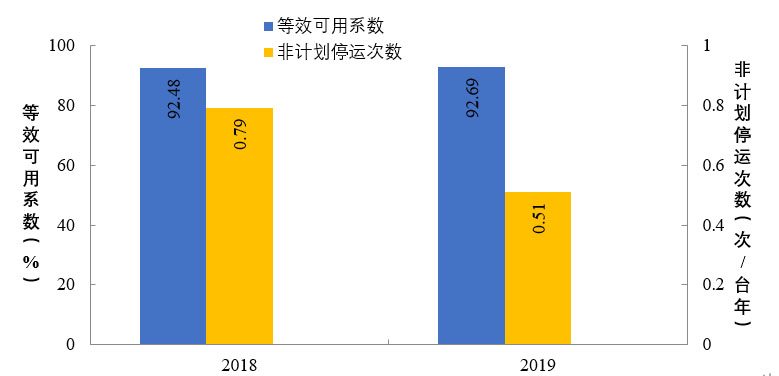 2019年,納入可靠性管理的超臨界及以上燃煤機(jī)組共547臺(tái)。平均等效可用系數(shù)92.8%,同比增長0.12個(gè)百分點(diǎn),非計(jì)劃停運(yùn)0.48次/臺(tái)年,同比降低0.33次/臺(tái)年。