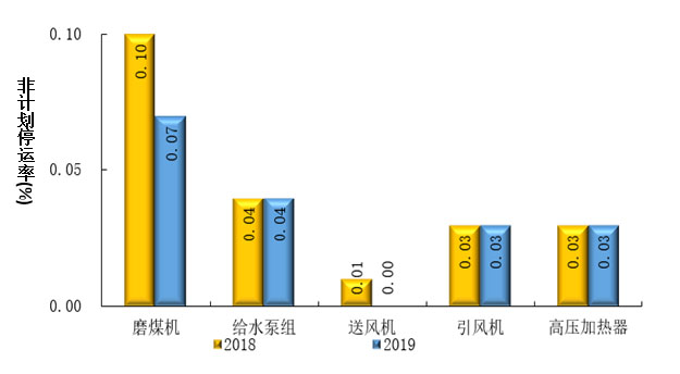 2019年,我國大型燃煤機(jī)組配套輔助設(shè)備健康水平穩(wěn)定提高。參與統(tǒng)計(jì)的五種輔助設(shè)備即磨煤機(jī)、給水泵組、送風(fēng)機(jī)、引風(fēng)機(jī)、高壓加熱器的運(yùn)行系數(shù)同比分別上升0.86、2.82、1.08、1.08和1.09個(gè)百分點(diǎn)。磨煤機(jī)、送風(fēng)機(jī)非計(jì)劃停運(yùn)率同比下降,給水泵組、引風(fēng)機(jī)、高壓加熱器同比持平。