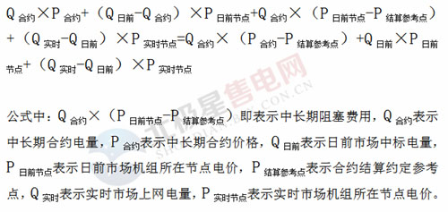 在目前的電力市場(chǎng)現(xiàn)貨結(jié)算中,實(shí)行節(jié)點(diǎn)邊際電價(jià)的地區(qū)都會(huì)產(chǎn)生阻塞費(fèi)用。阻塞費(fèi)用包括中長(zhǎng)期阻塞費(fèi)用和現(xiàn)貨阻塞費(fèi)用兩部分。中長(zhǎng)期阻塞費(fèi)用普遍存在于中長(zhǎng)期合約金融結(jié)算且現(xiàn)貨市場(chǎng)按偏差電量結(jié)算,合約雙方需約定合約金融交割點(diǎn),對(duì)于合約結(jié)算來(lái)說(shuō)就是結(jié)算參考點(diǎn)了,實(shí)質(zhì)上就是中長(zhǎng)期差價(jià)合約結(jié)算的另一種表達(dá)。如下機(jī)組電能量結(jié)算公式所示: