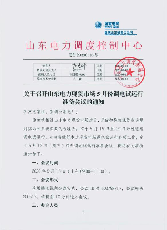 5月12日,山東電力調(diào)度控制中心發(fā)布了《關(guān)于召開山東電力現(xiàn)貨市場5月份調(diào)電試運行準(zhǔn)備會議的通知》(以下簡稱《通知》)。《通知》稱為加快推進山東電力現(xiàn)貨市場建設(shè),評估和檢驗現(xiàn)貨市場規(guī)則體系和參數(shù)的合理性,擬于5月15日至19日開展連續(xù)調(diào)電試運行。