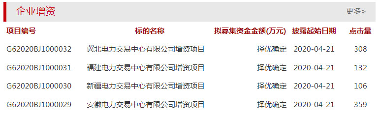 另外,在2020年初,國(guó)家電網(wǎng)在北京產(chǎn)權(quán)交易所陸續(xù)掛牌天津、江蘇、湖南、吉林、遼寧等6個(gè)電力交易中心增資項(xiàng)目,其中,各項(xiàng)目用于增資的股權(quán)比例不一,擬征集投資方數(shù)量、投資方資格條件不一,擬募集資金總額則均為“擇優(yōu)確定”。此舉標(biāo)志著電力交易中心股份制改造又向前邁進(jìn)一大步。