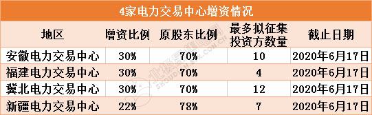 根據(jù)公告中顯示,四家電力交易中心的增資項(xiàng)目的截止日期為2020年6月17日,擬募集資金總額則均為“擇優(yōu)確定”。其中安徽電力交易中心、福建電力交易中心和冀北電力交易中心的擬募集資金對(duì)應(yīng)持股比例或股份數(shù)均為不超過30%,新疆電力交易中心公開增資比例稍小,引入新的投資方持股合計(jì)22%以內(nèi)。