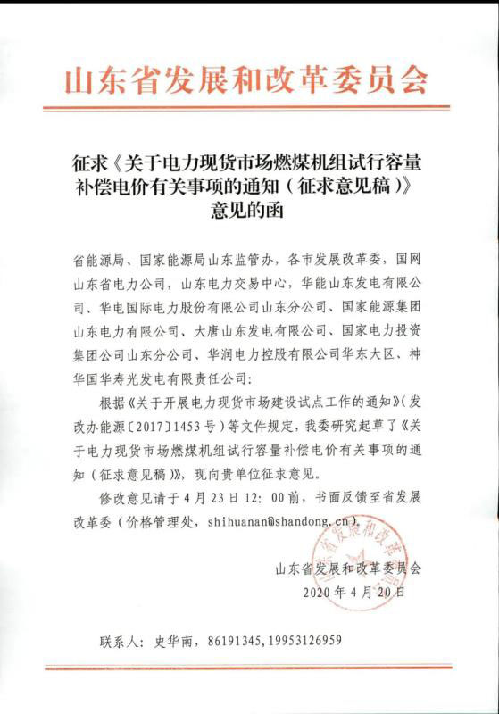 為穩(wěn)妥推進山東電力現(xiàn)貨市場建設,根據(jù)《關于開展電力現(xiàn)貨市場建設試點工作的通知》(發(fā)改辦能源〔2017〕1453號)、《關于深化電力現(xiàn)貨市場建設試點工作的意見》(發(fā)改辦能源規(guī)〔2019〕828號)、《山東省深化燃煤發(fā)電上網(wǎng)電價形成機制改革實施方案》(魯發(fā)改價格〔2019〕1228號)等文件規(guī)定,我委起草了《關于電力現(xiàn)貨市場燃煤機組試行容量補償電價有關事項的通知(征求意見稿)》,現(xiàn)向社會公開征求意見。