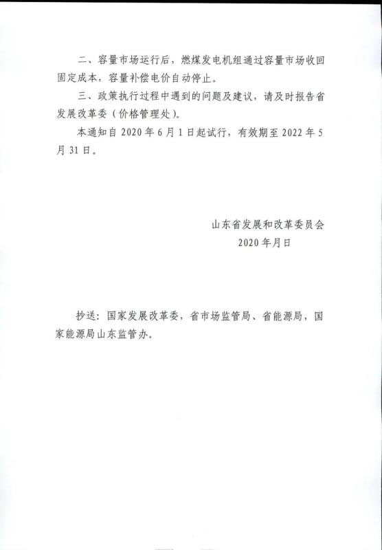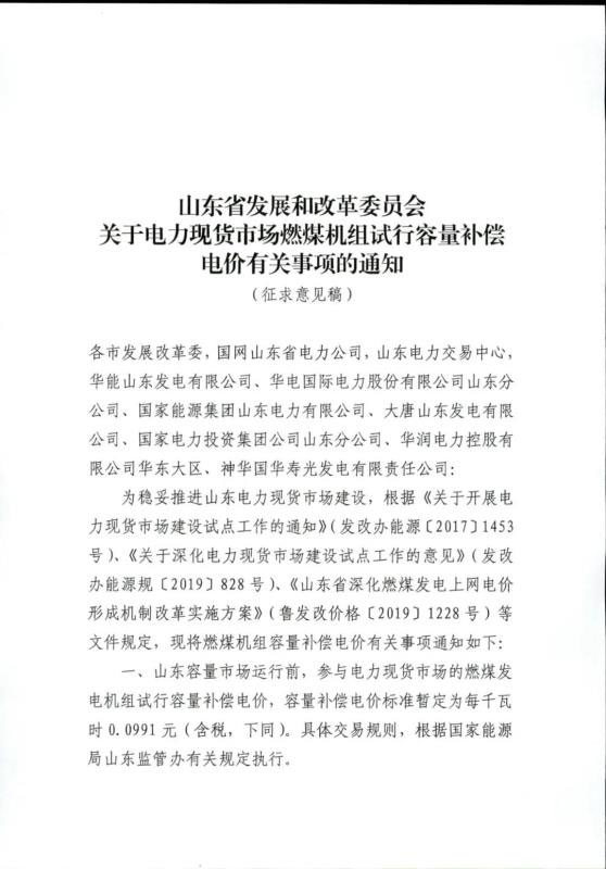 為穩(wěn)妥推進山東電力現(xiàn)貨市場建設,根據(jù)《關于開展電力現(xiàn)貨市場建設試點工作的通知》(發(fā)改辦能源〔2017〕1453號)、《關于深化電力現(xiàn)貨市場建設試點工作的意見》(發(fā)改辦能源規(guī)〔2019〕828號)、《山東省深化燃煤發(fā)電上網(wǎng)電價形成機制改革實施方案》(魯發(fā)改價格〔2019〕1228號)等文件規(guī)定,現(xiàn)將燃煤機組容量補償電價有關事項通知如下: