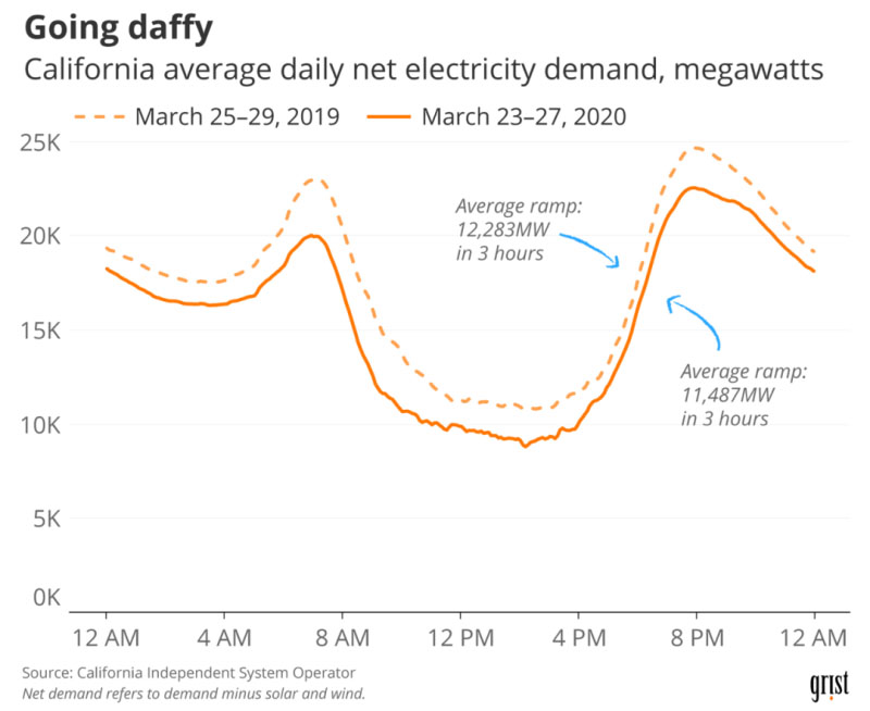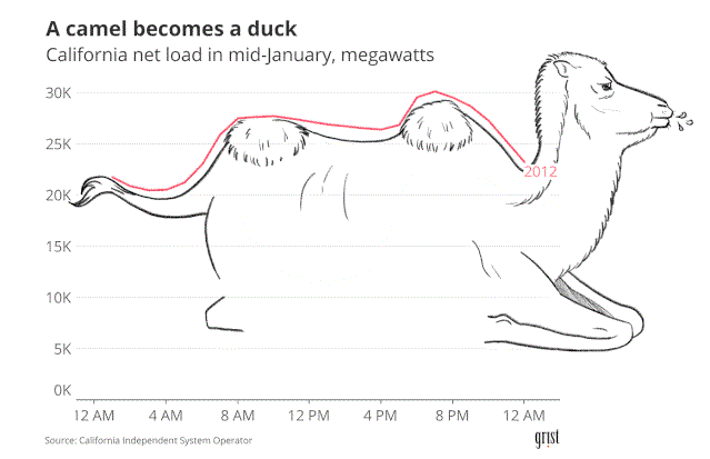據(jù)Vox網(wǎng)站報道,隨著成千上萬的美國人因為疫情改變生活方式,他們也在無意中改變了電力負(fù)荷曲線。在疫情之前,人們在早晨出門上班和上學(xué)之前要消耗大量的電,晚上回家時要用更多的電,形成電力負(fù)荷的 “駱駝曲線”,在早晨和傍晚有兩個駝峰。如果電網(wǎng)從太陽能獲取電力的比例增加,負(fù)荷曲線會變成“鴨子曲線”,典型例子是加利福尼亞州,風(fēng)能和太陽能發(fā)電占其總電量的23%。