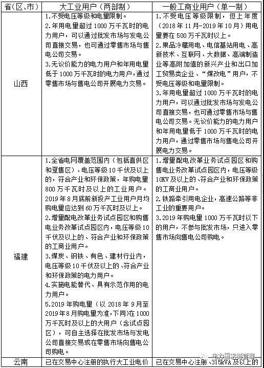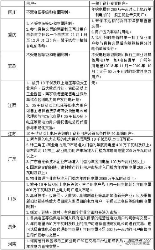 按照《關(guān)于全面放開經(jīng)營性電力用戶發(fā)用電計劃的通知》(發(fā)改運行〔2019〕1105 號)要求,除居民、農(nóng)業(yè)、重要公用事業(yè)和公益性服務(wù)等行業(yè)電力用戶以及電力生產(chǎn)供應(yīng)所必需的廠用電和線損之外,逐步全面放開經(jīng)營性領(lǐng)域電力用戶參與市場交易,且各類電力用戶應(yīng)符合國家產(chǎn)業(yè)政策要求,產(chǎn)品和工藝屬于《產(chǎn)業(yè)結(jié)構(gòu)調(diào)整指導(dǎo)目錄》(2019本)中淘汰類和限制類且執(zhí)行差別電價政策的電力用戶暫不參與市場化交易。除上述要求外,2020年部分地區(qū)對市場交易用戶準(zhǔn)入條件要求如下: