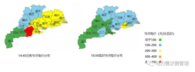 以廣東電力交易中心2019年10月27日現(xiàn)貨市場交易結(jié)果為例,日前市場發(fā)電側(cè)價格最低70元/兆瓦時,最高895元/兆瓦時,總成交電量7.45億千瓦時,峰荷時刻14點45分江門市節(jié)點電價最高;實時市場發(fā)電側(cè)價格最低70元/兆瓦時,最高347.11元/兆瓦時,總成交電量7.04億千瓦時,峰荷時刻轉(zhuǎn)移至10點30分,江門市節(jié)點電價降低至200元/兆瓦時以下。日前現(xiàn)貨價格作為市場主體的決策風(fēng)向標(biāo),有效地緩解了實時當(dāng)天系統(tǒng)高峰負(fù)荷場景下網(wǎng)絡(luò)阻塞情況。