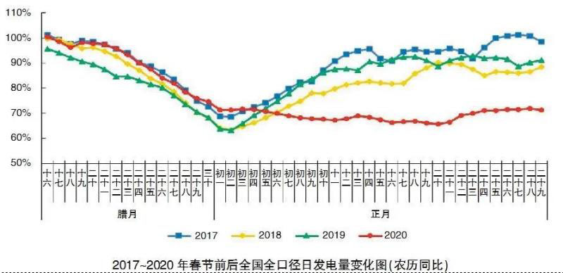 春節(jié)假期內(nèi)用電未能實現(xiàn)“觸底反彈”。根據(jù)往年規(guī)律,春節(jié)前后日電量變化呈現(xiàn)“V字型”走勢,正月十五回升至節(jié)前基礎水平的90%左右。受新冠疫情影響,2020年春節(jié)假期(臘月三十至正月初九)內(nèi)日電量未能實現(xiàn)“觸底反彈”,全國全口徑發(fā)電量日均農(nóng)歷同比下降0.1%,為節(jié)前基礎水平的70.6%,略低于近三年72.0%的平均水平。