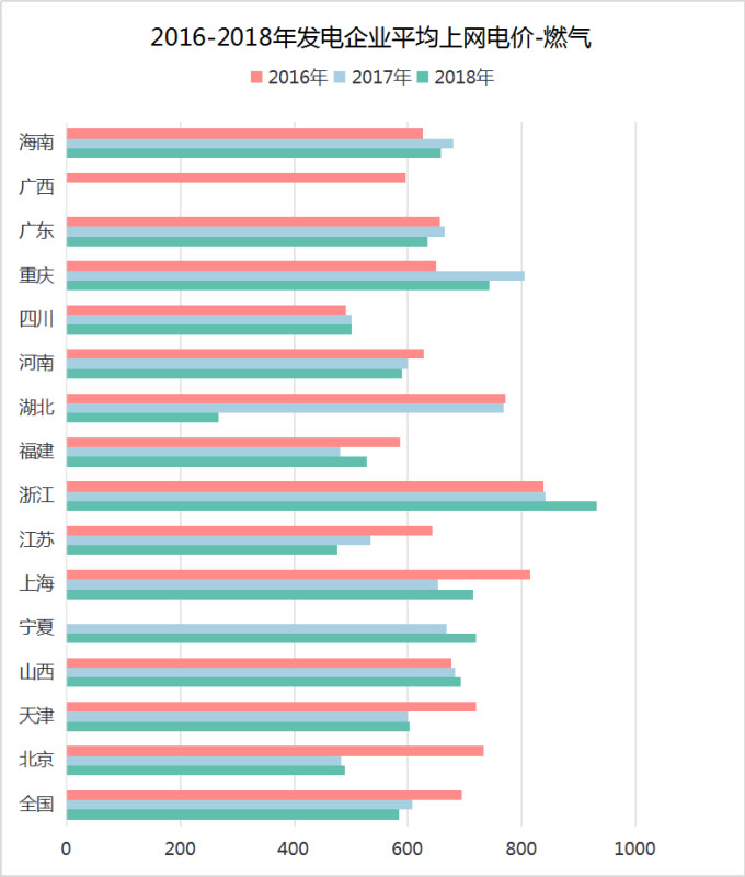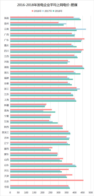 如圖4所示,2017年中,因國家發(fā)改委發(fā)布《關(guān)于取消、降低部分政府性基金及附加合理調(diào)整電價結(jié)構(gòu)的通知》,自2017年7月1日起,取消向發(fā)電企業(yè)征收的工業(yè)企業(yè)結(jié)構(gòu)調(diào)整專項資金,騰出的電價空間用于提高燃煤電廠標(biāo)桿電價,緩解燃煤發(fā)電企業(yè)經(jīng)營困難,2016-2018年全國燃煤平均上網(wǎng)電價有所增長。其中,青海、甘肅、湖北三地2018年平均上網(wǎng)電價較2017年漲幅最為顯著。