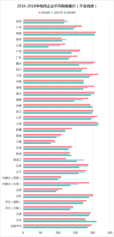 圖2 2016-2018年電網(wǎng)企業(yè)平均購銷差價(含線損)