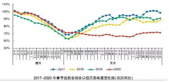 春節(jié)假期內(nèi)用電未能實(shí)現(xiàn)“觸底反彈”。根據(jù)往年規(guī)律,春節(jié)前后日電量變化呈現(xiàn)“V字型”走勢(shì),正月十五回升至節(jié)前基礎(chǔ)水平的90%左右。受新冠疫情影響,2020年春節(jié)假期(臘月三十至正月初九)內(nèi)日電量未能實(shí)現(xiàn)“觸底反彈”,全國(guó)全口徑發(fā)電量日均農(nóng)歷同比下降0.1%,為節(jié)前基礎(chǔ)水平的70.6%,略低于近三年72.0%的平均水平。