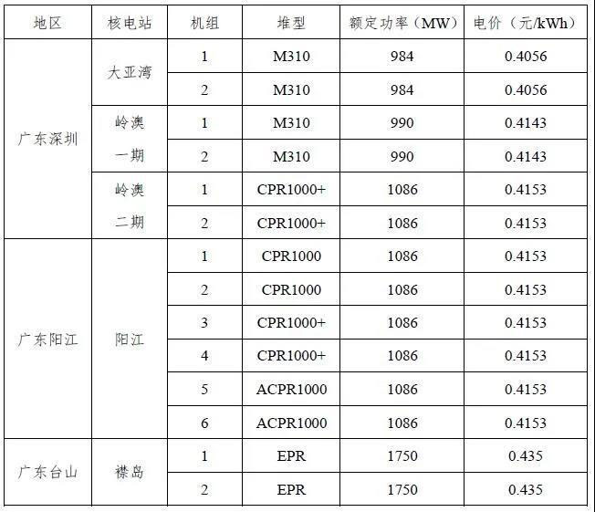 廣東現(xiàn)役的核電站有大亞灣核電站、嶺澳核電站一期項(xiàng)目、嶺澳核電站二期項(xiàng)目、陽(yáng)江核電及襟島核電廠,綜合投產(chǎn)年份和堆型不同,核電機(jī)組上網(wǎng)電價(jià)也不同,詳見表1。