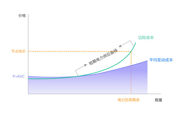 在解決了機組如何通過報價決定是否開機后,我們繼續(xù)分析機組的整體報價應(yīng)該處于什么水平才有利于實現(xiàn)利潤最大化。由于市場處于完全競爭的水平,所有以實現(xiàn)利潤最大化為目的的理性發(fā)電企業(yè),在P>AVC時會開機;所有開機機組只要節(jié)點電價在其邊際成本之上(邊際效益大于零),就有動機提升出力水平以增加利潤,直至邊際成本等于節(jié)點電價(邊際效益為零)或達到最大發(fā)電能力。換言之,邊際成本(MC)在平均變動曲線(AVC)之上的部分就是短期電力供應(yīng)曲線(如下圖所示)。當電力負荷需求確定時,節(jié)點電價會基本等于邊際機組的邊際成本。