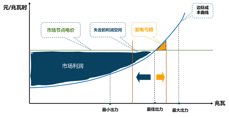 由上圖我們可清晰地看出,邊際成本曲線和邊際收益線相交處的邊際效益為零,此時如生產(chǎn)者繼續(xù)擴大產(chǎn)量將產(chǎn)生負的邊際效益。也就是說當邊際效益為正時,擴大產(chǎn)量可增加利潤;邊際效益為負時,減少產(chǎn)量可增加利潤。邊際成本曲線和邊際收益線相交處對應(yīng)的產(chǎn)量是利潤最大化的最佳產(chǎn)量。具體到電力現(xiàn)貨市場,發(fā)電企業(yè)的邊際收益就是節(jié)點電價,產(chǎn)量就是機組的出力水平,機組的最佳出力點正是邊際成本曲線與節(jié)點電價相交處對應(yīng)的出力。