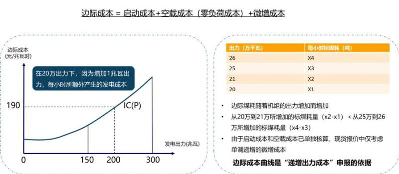 若想使發(fā)電利潤最大化,我們首先需要搞清邊際成本與邊際收益之間的關(guān)系。邊際成本指的是每一單位新增生產(chǎn)的產(chǎn)品帶來的總成本的增量,它通常是一條先下降再上升的U型曲線,這是因為邊際產(chǎn)量(增加一單位生產(chǎn)要素所增加的產(chǎn)量)是先上升后下降的。以煤電機組為例,隨著我們投煤量的上升,鍋爐溫度和效率也隨之提升,此時度電煤耗在持續(xù)下降——即每多投入一克煤可以(比之前)產(chǎn)生更多的電能量;但這種邊際產(chǎn)量上升的趨勢并不會一直持續(xù)下去,當鍋爐效率到達極限后,邊際產(chǎn)量將開始下降。在這里需要注意的是,由于我國的電力現(xiàn)貨市場采用了美國PJM市場的三部制報價,即報價被分為三個部分:①啟動成本②空載成本③微增成本。啟動成本是指火電機組的開機成本;空載成本是指使火電機組的汽輪機維持在一定轉(zhuǎn)速所需的成本;微增成本是指火電機組隨著出力上升而上升的成本。由于交易中心會按政府事先核定的固定價格補償啟動成本和空載成本,所以發(fā)電企業(yè)在日前市場報價時僅需要考慮邊際成本中的微增成本,這是一條單調(diào)上升的曲線。
